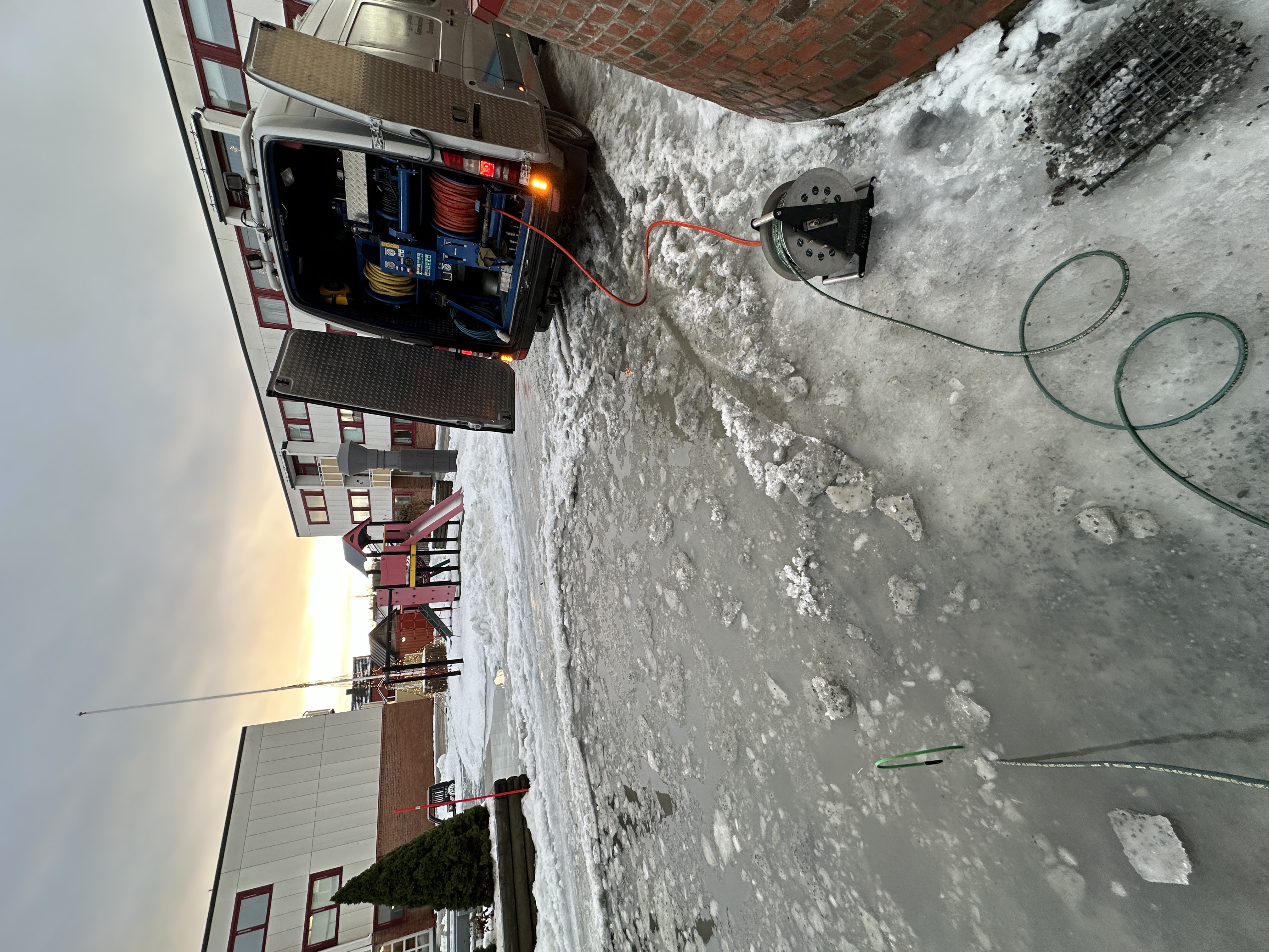 For utvendige vannledninger benytter vi en moderne spylebil utviklet for krevende vinterforhold. Med høy ytelse og presis kontroll kan vi tine selv lange og vanskelig tilgjengelige strekk.